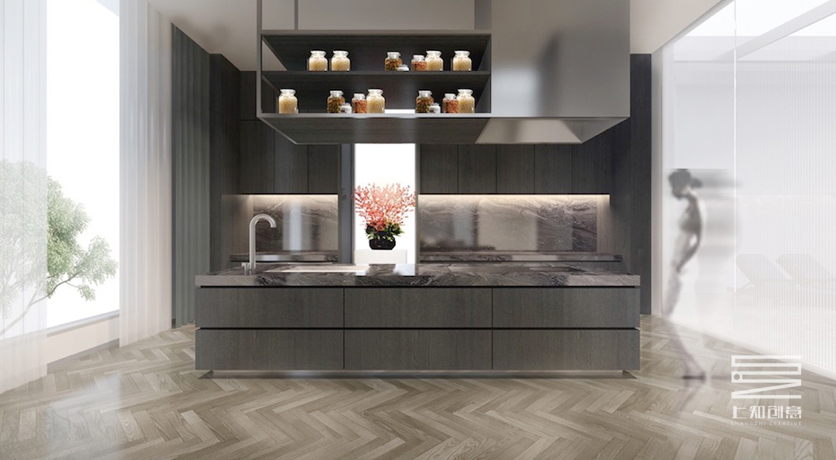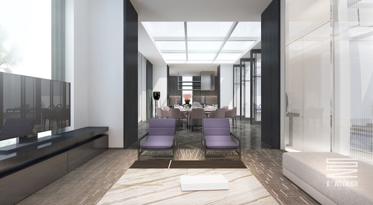 設(shè)計(jì)說(shuō)明:通過(guò)簡(jiǎn)潔的線條,以黑白灰為作為空間的主色調(diào),搭配紫色,橙色為跳躍色的現(xiàn)代設(shè)計(jì)手法,主要材料有灰色地毯,人字拼木地板,通透的玻璃隔斷,黑色木制隔柵。另頂層的游泳池,輔以古樸的瓦礫墻,搭配綠植,既生動(dòng)又美觀。
