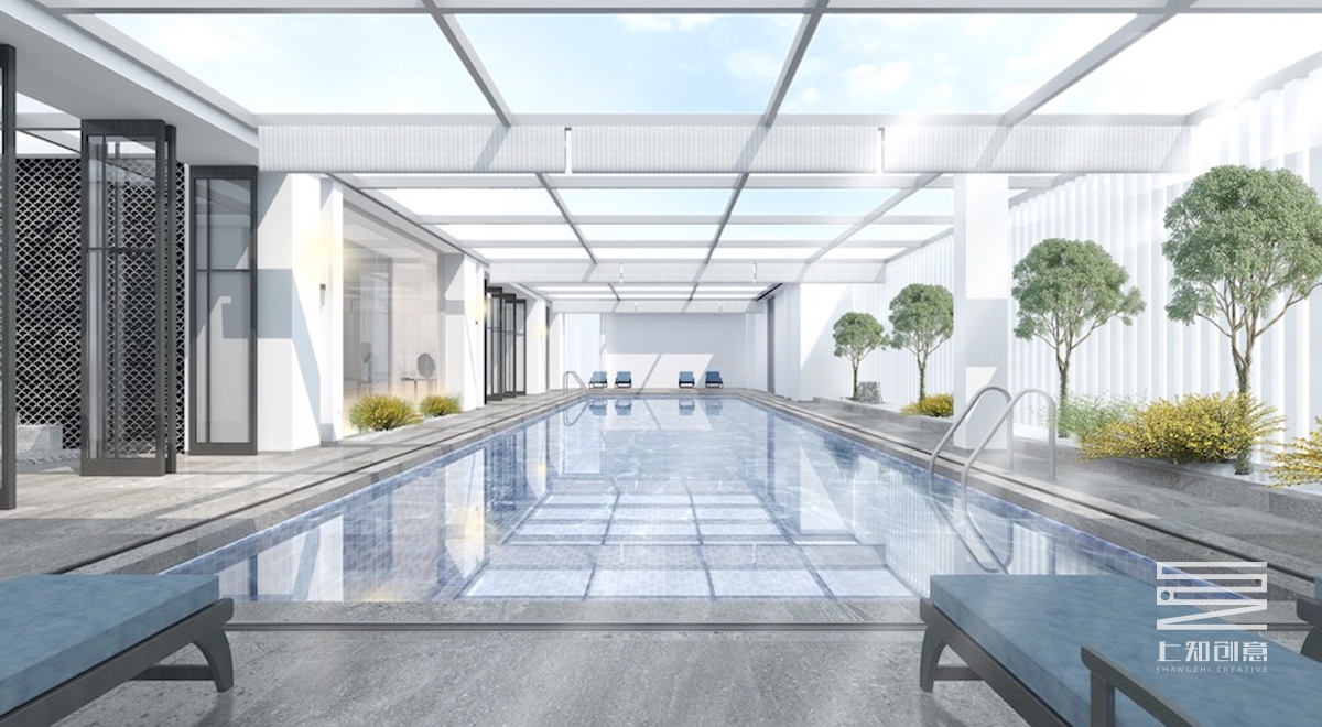 設(shè)計(jì)說(shuō)明:通過(guò)簡(jiǎn)潔的線條,以黑白灰為作為空間的主色調(diào),搭配紫色,橙色為跳躍色的現(xiàn)代設(shè)計(jì)手法,主要材料有灰色地毯,人字拼木地板,通透的玻璃隔斷,黑色木制隔柵。另頂層的游泳池,輔以古樸的瓦礫墻,搭配綠植,既生動(dòng)又美觀。